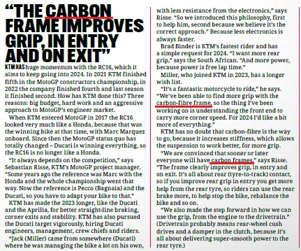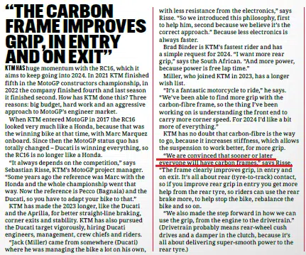 «Para ser claros en esto, nadie de KTM aclaró que el nuevo chasis era de fibra de carbono en 2023, por lo que nos sorprendió y decepcionó leerlo como una cita de un portavoz oficial de KTM».