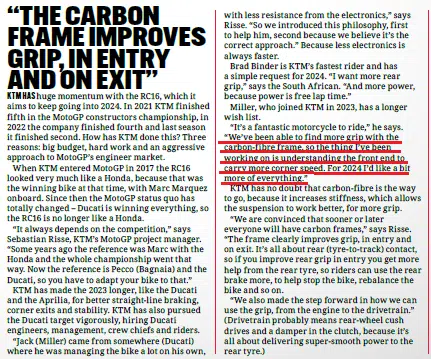 «A pesar de la masiva inversión económica de KTM y Red Bull, de trabajar con Red Bull Advanced Technologies (posiblemente los mejores aerodinamistas del mundo en deportes de motor), de tener uno de los mejores pilotos de la parrilla y de arrebatar a Ducati y Öhlins algunos de los mejores cerebros de MotoGP, KTM es el único fabricante que no ha ganado un solo gran premio sobre seco en casi tres años, concretamente desde junio de 2021. Incluso Honda y Suzuki han ganado más carreras sobre seco en ese periodo».
