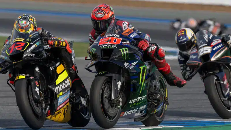 Foto de apertura: Foto: Atacado por todas partes por las V4, Quartararo sucumbía ante la Ducati de Marco Bezzecchi en el pasado GP de Tailandia. En la siguiente curva perdía otra posición en favor de la Aprilia de Raúl Fernández (#25). Foto: Yamaha.